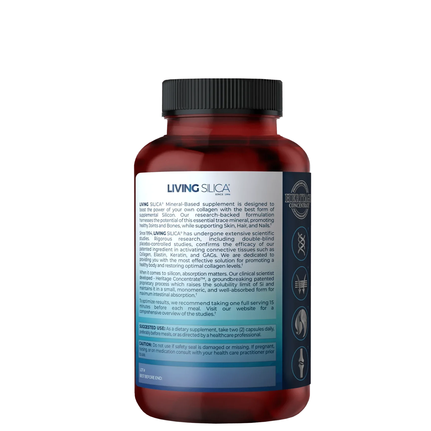 LIVING SILICA® is a doctor-formulated, professional-gradesupplement designed to support your natural healthy collagen production. Formulated in 1994 by Sc. D. Loïc Le Ribault, and with more than 30 years in the market, LIVING SILICA® pioneered a proprietary process known as Heritage Concentrate™. Heritage Concentrate™is the proprietary process used across all LIVING SILICA® products. It raises the solubility limit of silicon (Si) and maintains it in a small, monomeric, and well-absorbed form for optimal intestinal absorption.This unique process ensures that you get the most out of every dose of LIVING SILICA®, making it the perfect addition to your daily health routine.